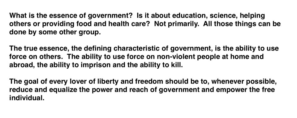 The true essence, the defining characteristic of government, is the ability to use force on others. The ability to use force on non-violent people at home and abroad, the ability to imprison and the ability to kill.